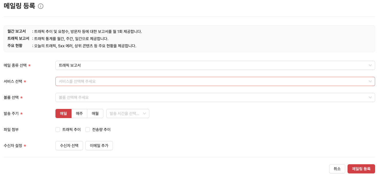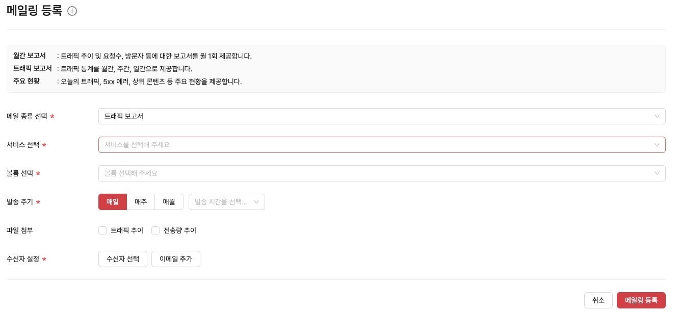 서비스, 볼륨 단위로 메일링 서비스 등록이 가능 하며, 내 계정 외 다른 계정에게도 메일링을 등록 할 수 있습니다.